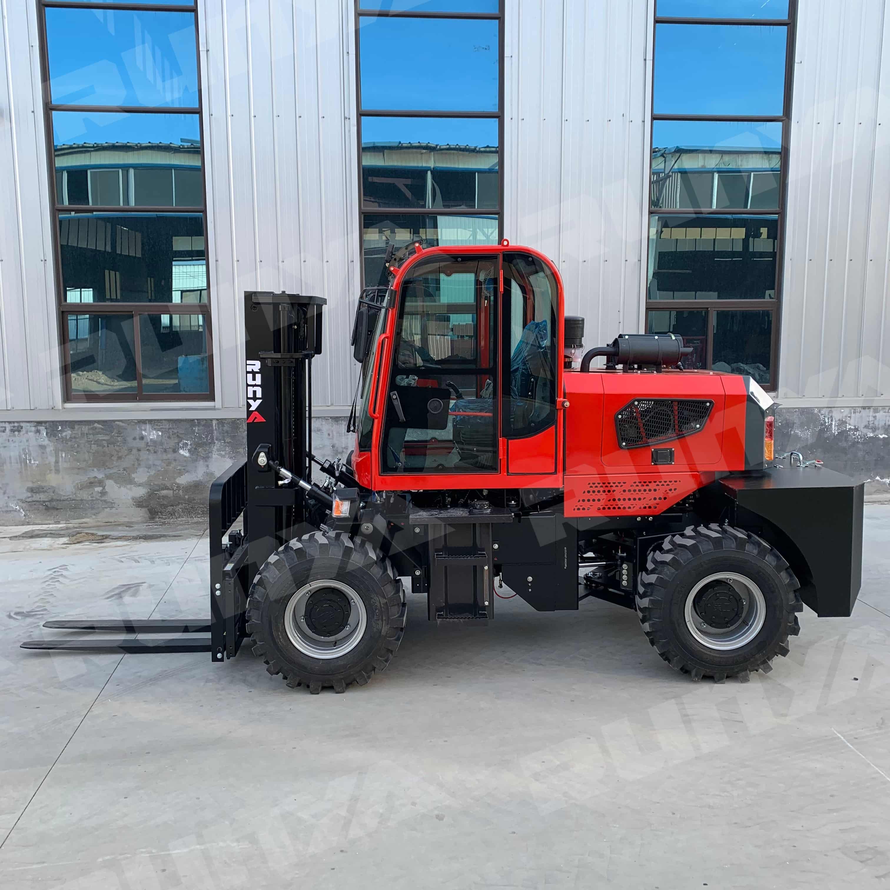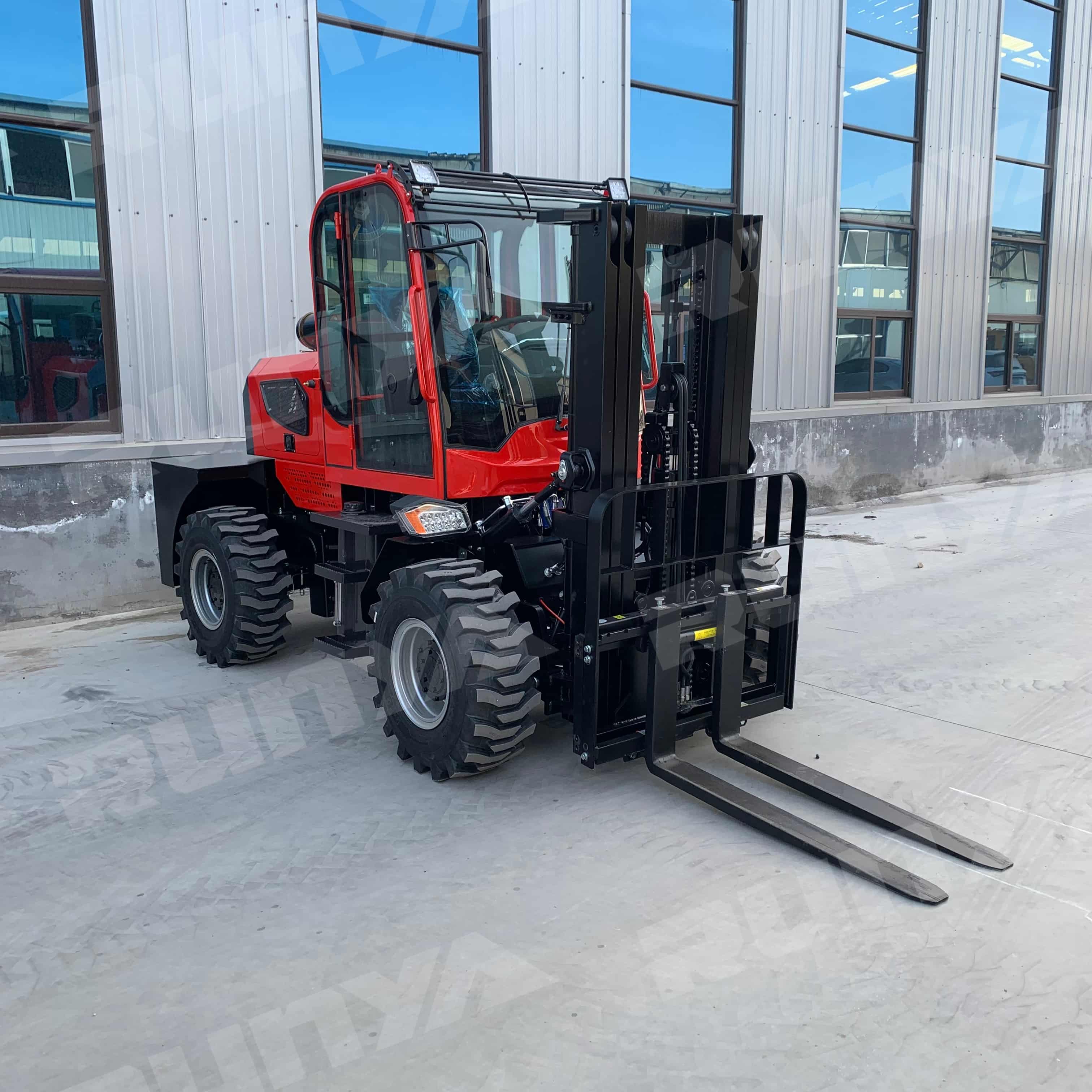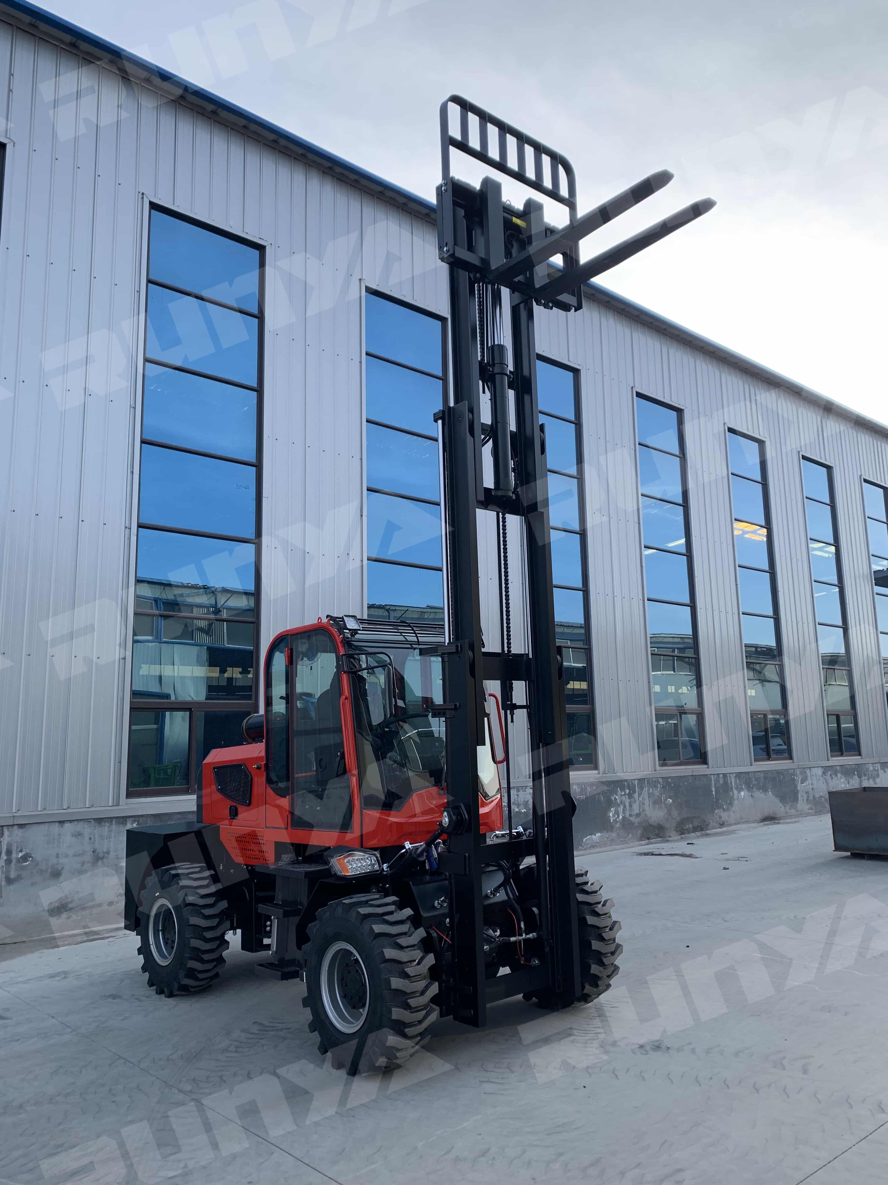 The RY-type 4WD rough terrain forklift boasts powerful performance, strong drive, high climbing ability, and excellent maneuverability. It can operate on rugged terrain, sand, or mud. Our company specializes in manufacturing 4WD rough terrain forklifts.