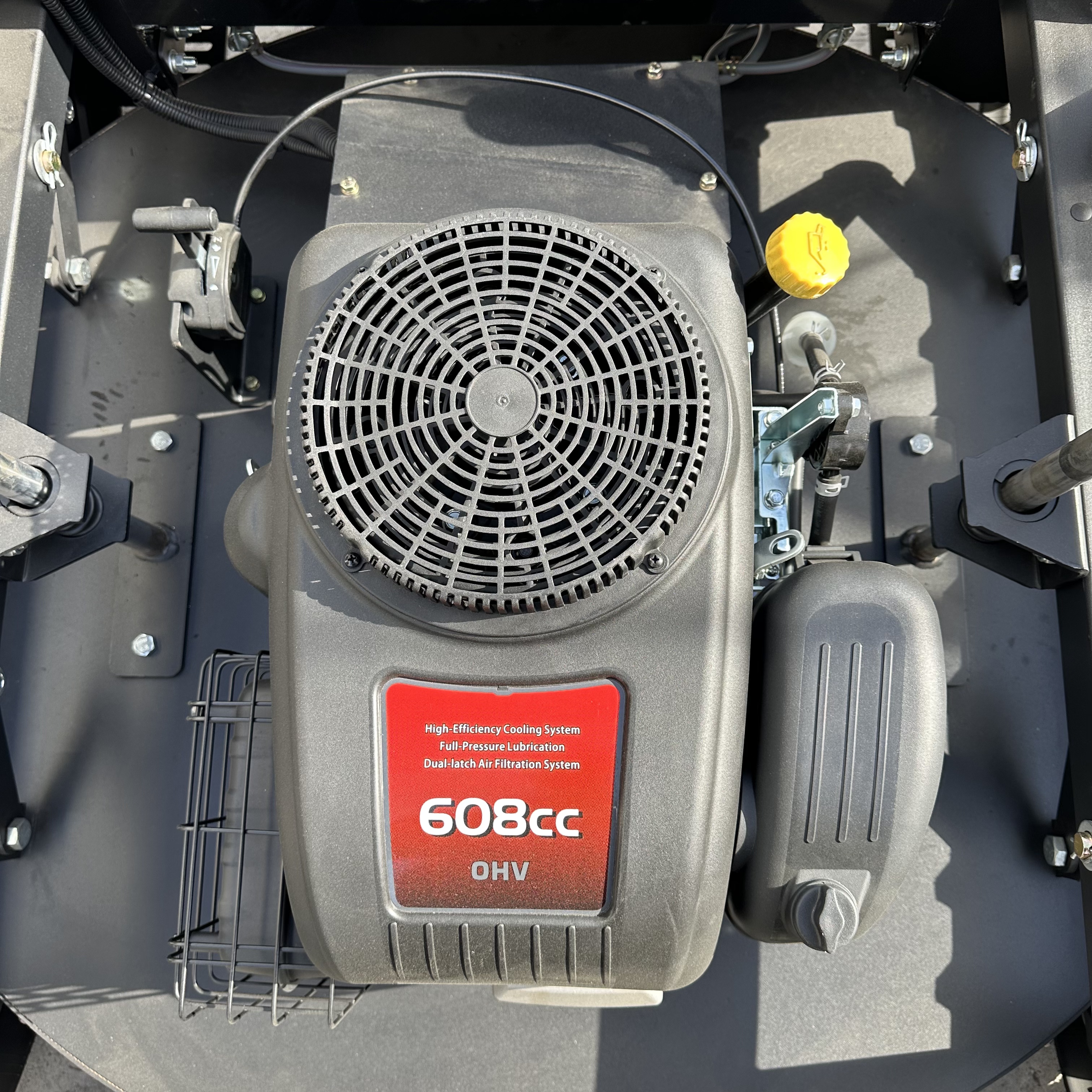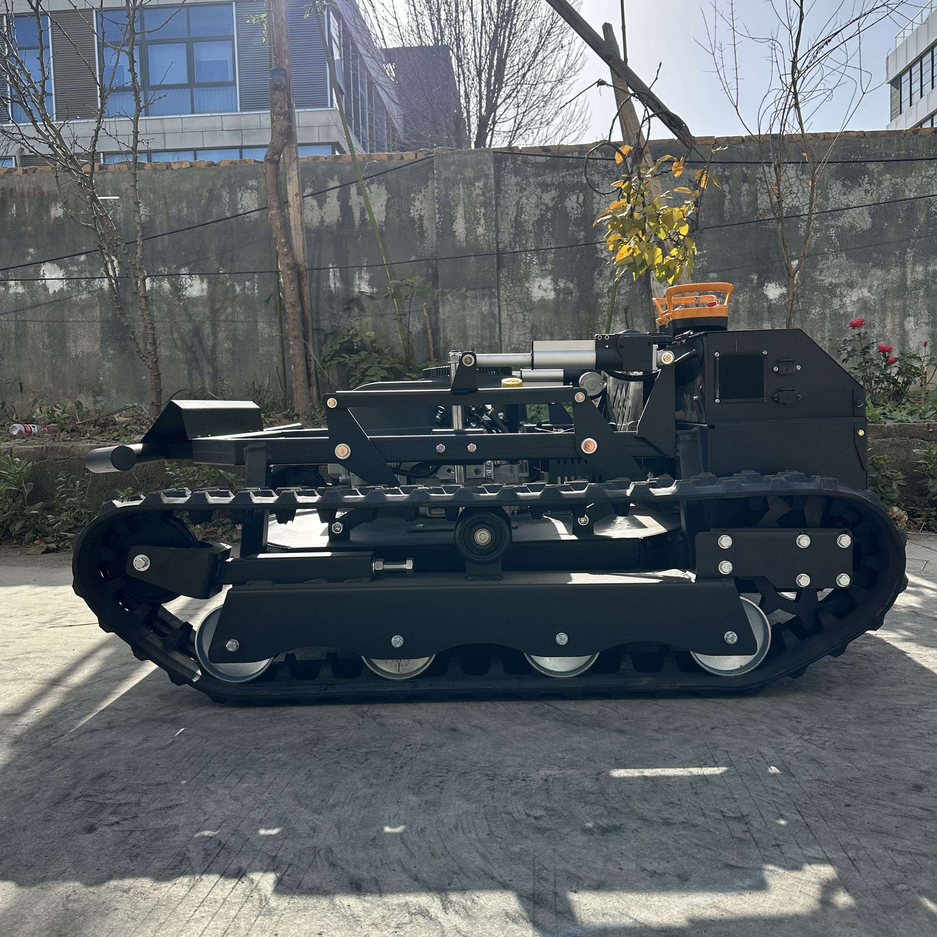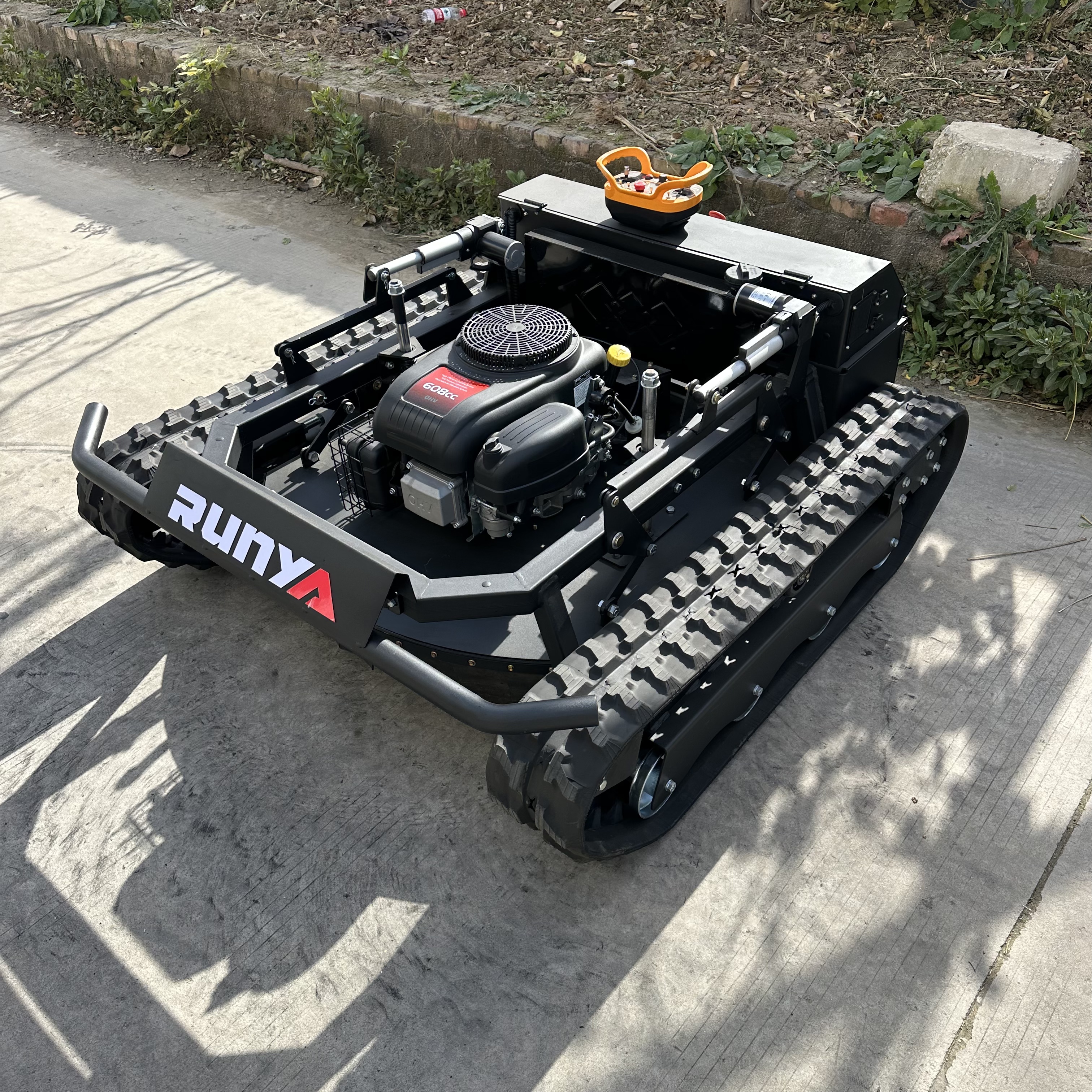 The RY-906 remote-controlled lawnmower has a mowing width of 900mm. It is powered by a Loncin gasoline engine, a hybrid power source, and features an integrated generator that automatically recharges during operation. The motor is a brushed motor, energy-efficient and durable. The generator is a marine-grade unit with an extremely low failure rate and long lifespan. Control is achieved through an industrial remote control device, which is simple to operate, has a low failure rate, and a remote control distance of 200 meters. The tracks feature an internal steel frame and steel wire mesh, with an external engineering rubber design, making them wear-resistant and durable. The reinforced chassis and low-profile design, reminiscent of a tank, make it excellent for climbing slopes and crossing ditches.