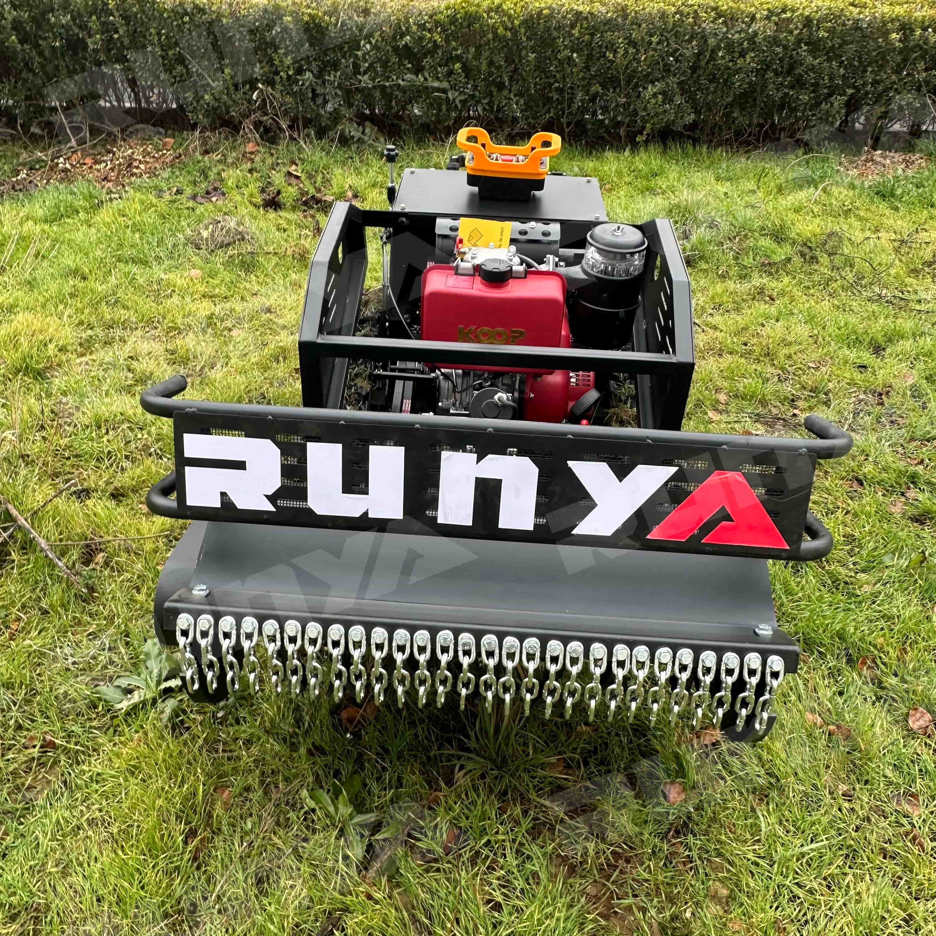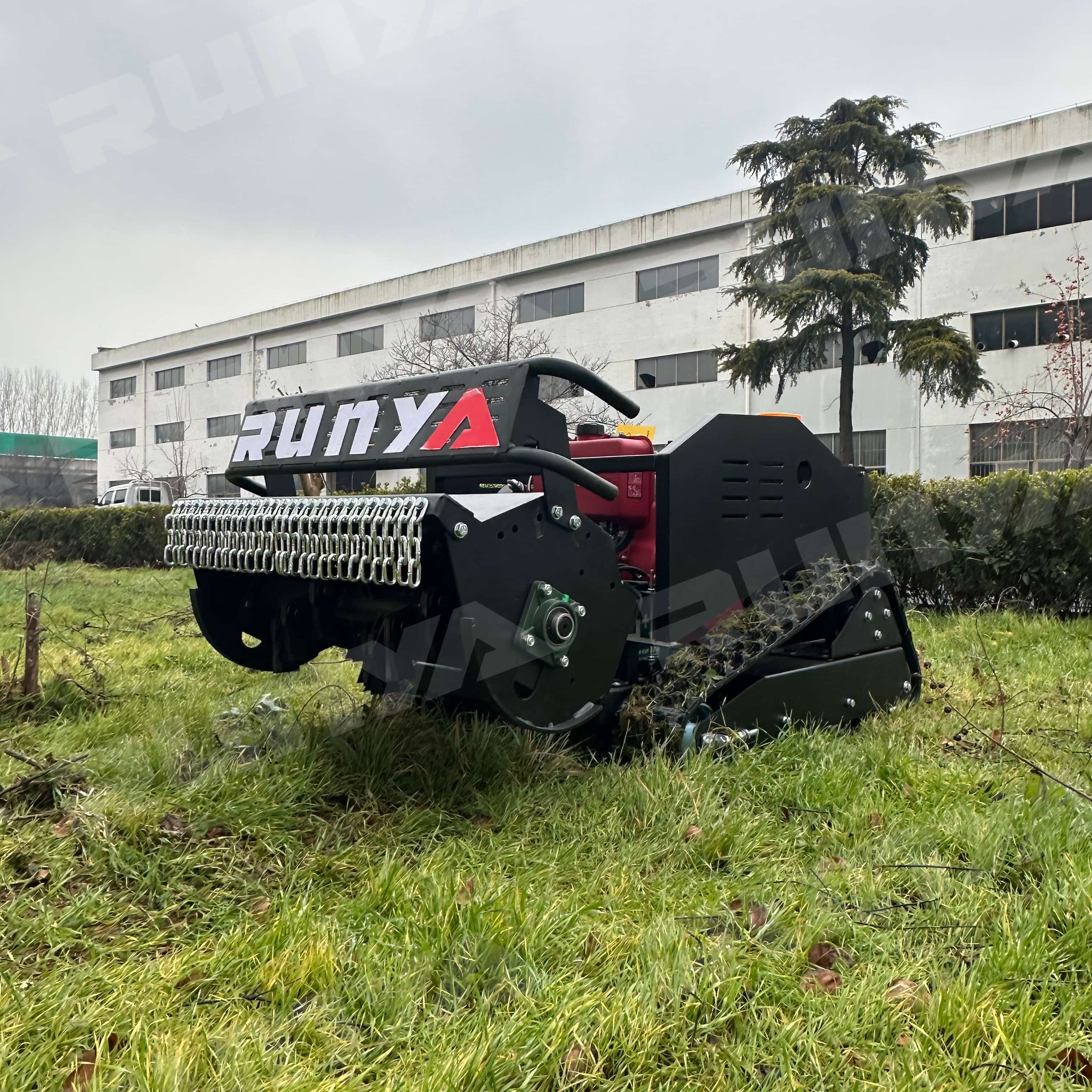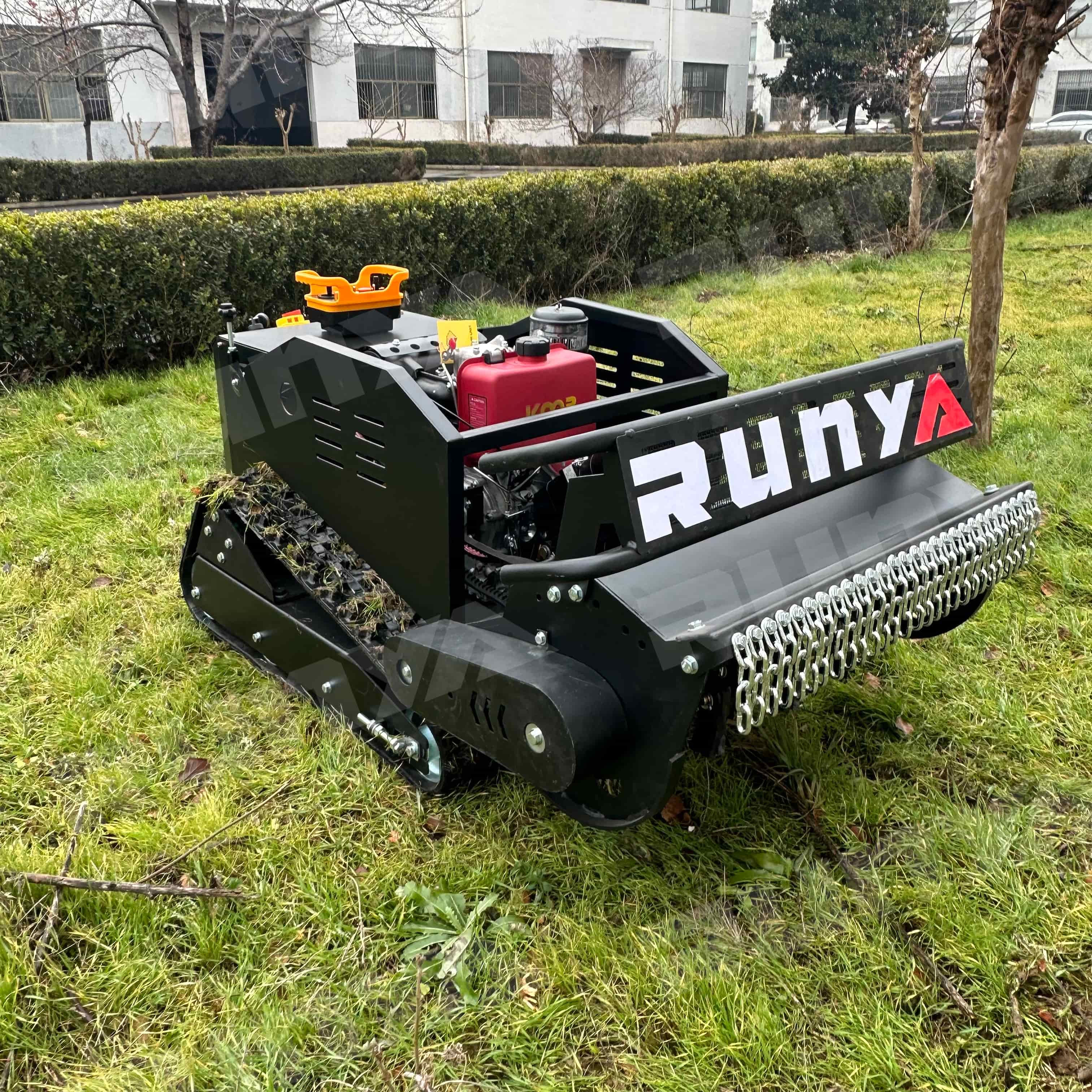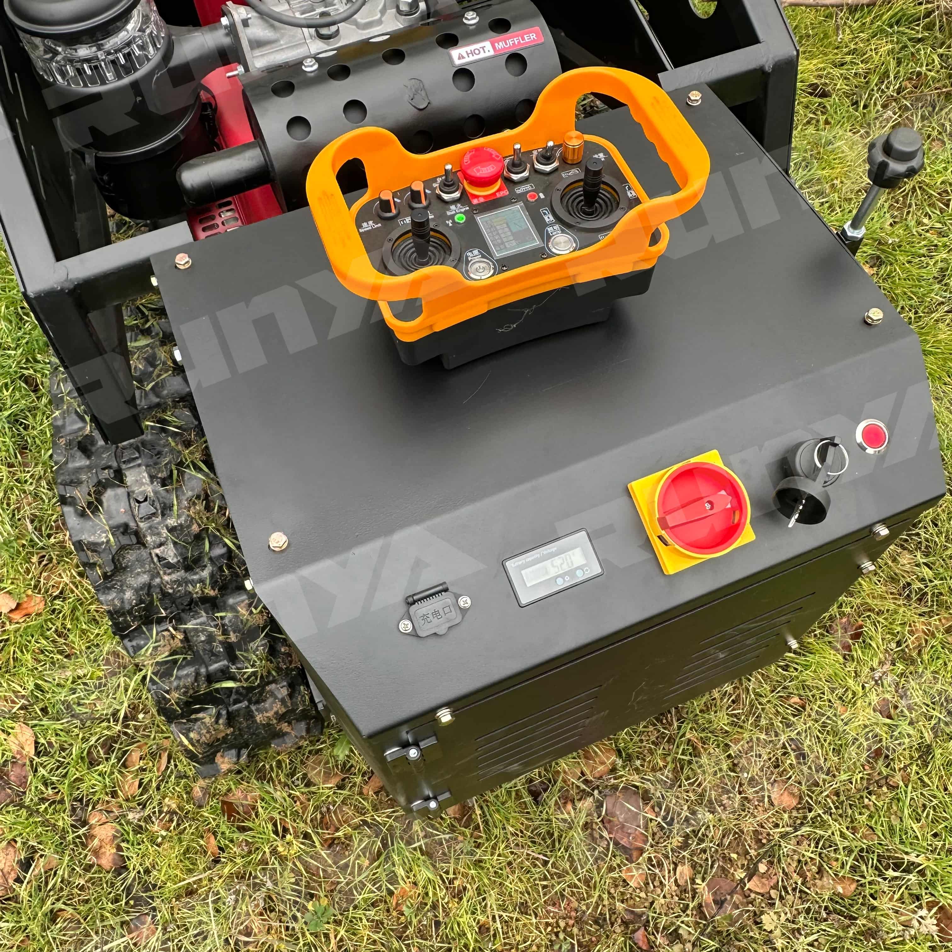 The RY-801 remote-controlled lawnmower has a mowing width of 800mm. It is powered by a Yuchai diesel engine, a hybrid power source, and features an integrated generator that automatically recharges during operation. The motor is a brushless motor, energy-efficient and durable. The generator is a marine-grade unit with an extremely low failure rate and long lifespan. Control is achieved through an industrial remote control device, which is simple to operate, has a low failure rate, and a remote control distance of 200 meters. The grass height left is adjustable from 3-12 cm, and the mowing speed is remotely adjustable. The tracks feature an internal steel frame and steel wire, with an external engineering rubber design, making them wear-resistant and durable.