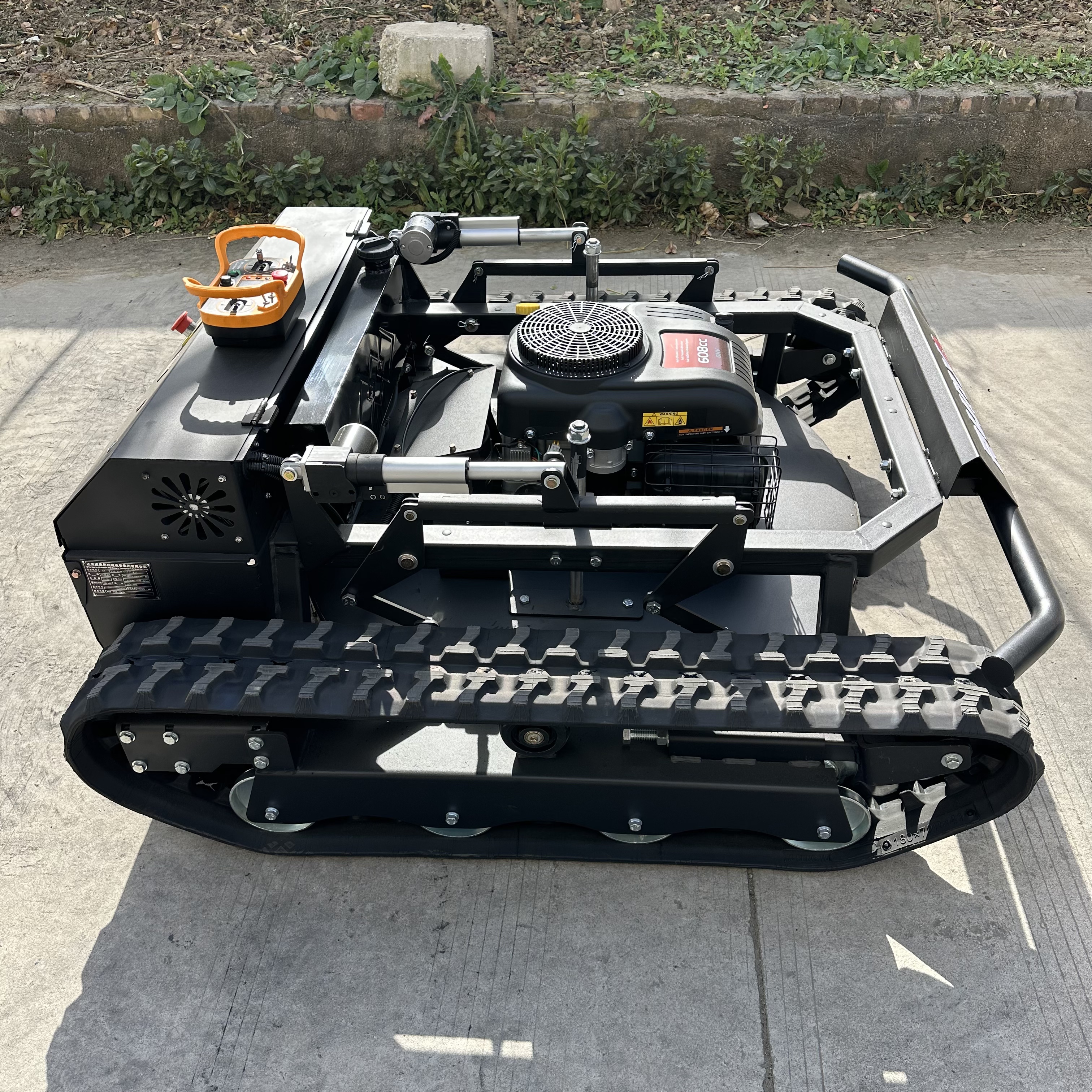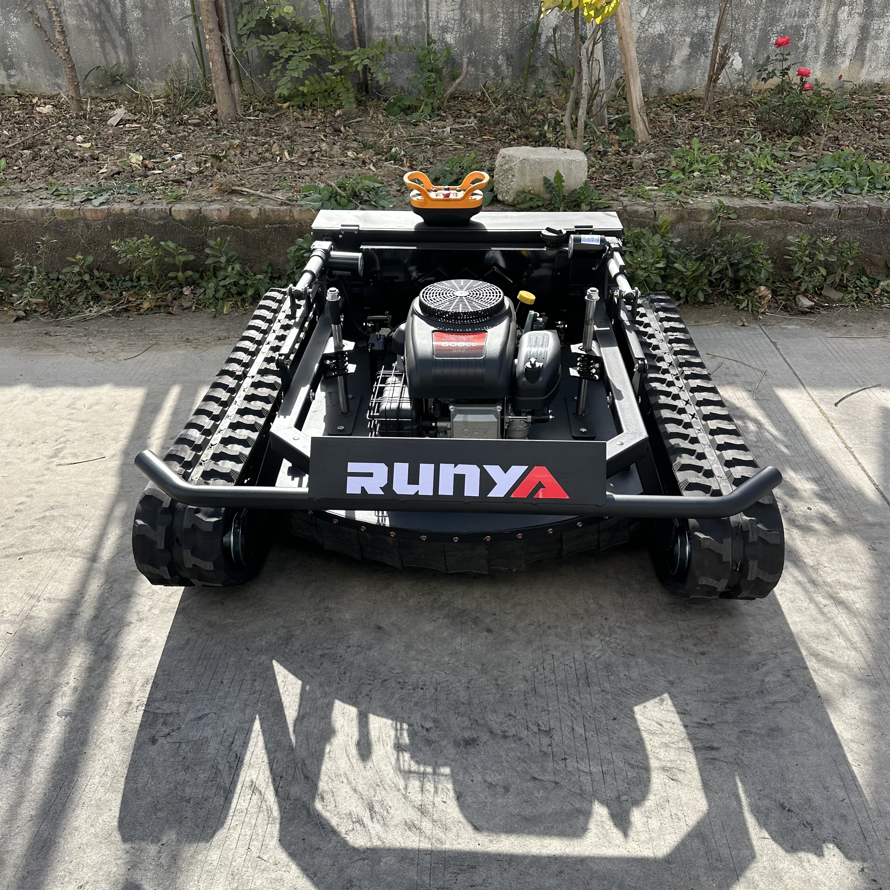 The RY-906 remote-controlled lawnmower has a mowing width of 900mm. It is powered by a Loncin gasoline engine, a hybrid power source, and features an integrated generator that automatically recharges during operation. The motor is a brushed motor, energy-efficient and durable. The generator is a marine-grade unit with an extremely low failure rate and long lifespan. Control is achieved through an industrial remote control device, which is simple to operate, has a low failure rate, and a remote control distance of 200 meters. The tracks feature an internal steel frame and steel wire mesh, with an external engineering rubber design, making them wear-resistant and durable. The reinforced chassis and low-profile design, reminiscent of a tank, make it excellent for climbing slopes and crossing ditches.