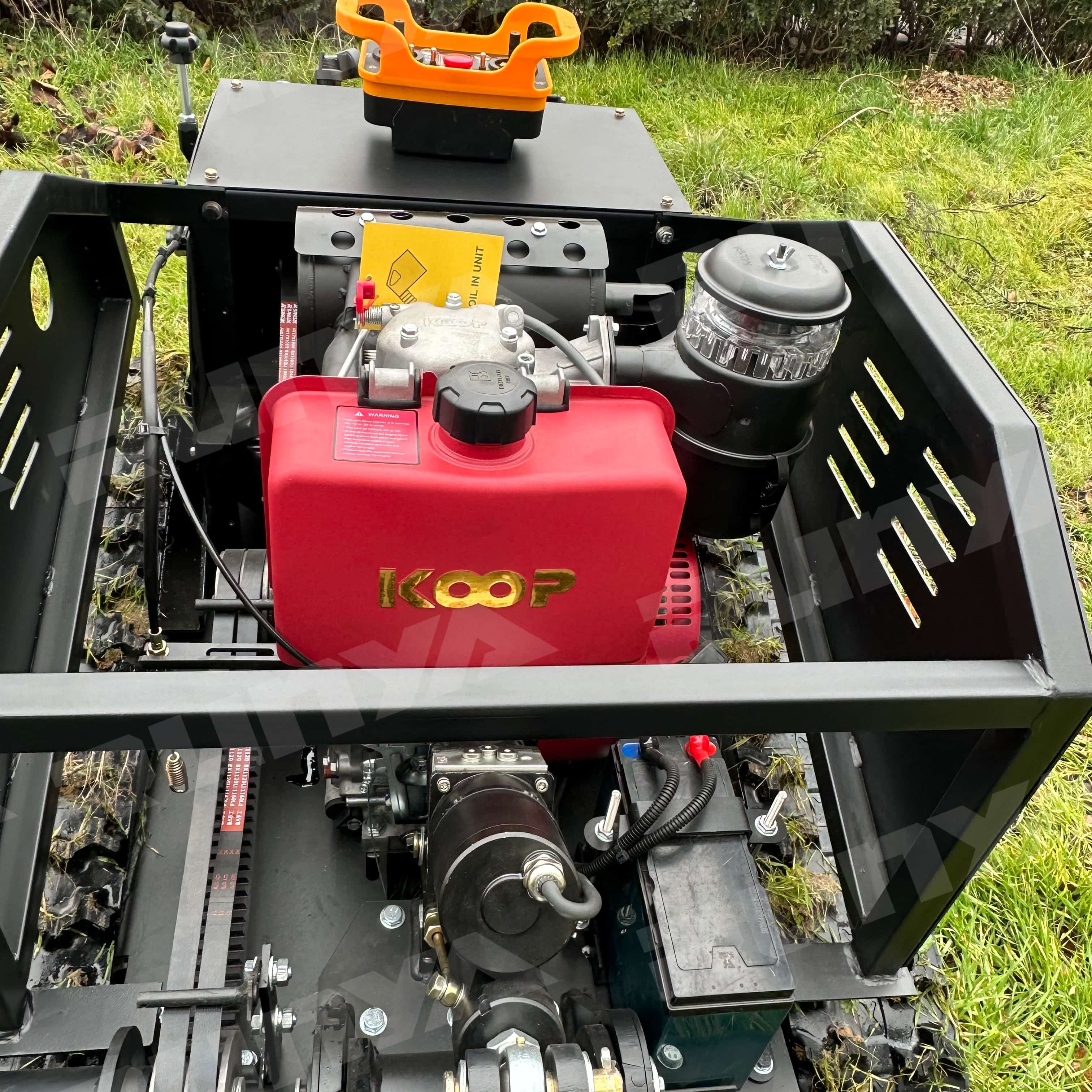 The RY-801 remote-controlled lawnmower has a mowing width of 800mm. It is powered by a Yuchai diesel engine, a hybrid power source, and features an integrated generator that automatically recharges during operation. The motor is a brushless motor, energy-efficient and durable. The generator is a marine-grade unit with an extremely low failure rate and long lifespan. Control is achieved through an industrial remote control device, which is simple to operate, has a low failure rate, and a remote control distance of 200 meters. The grass height left is adjustable from 3-12 cm, and the mowing speed is remotely adjustable. The tracks feature an internal steel frame and steel wire, with an external engineering rubber design, making them wear-resistant and durable.